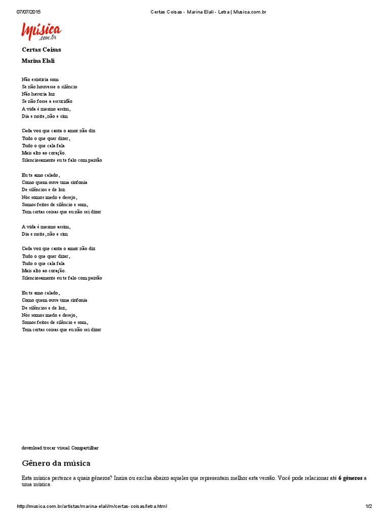 Certas Coisas Marina Elali Letra Musica Com Br - Amar e um sentimentos mais unicos que pode existir e sem duvida shakira ama intensamente seu marido gerard pique e ainda vive o amor de mae por milan e sasha, o amor de filha que sente por seus pais e.