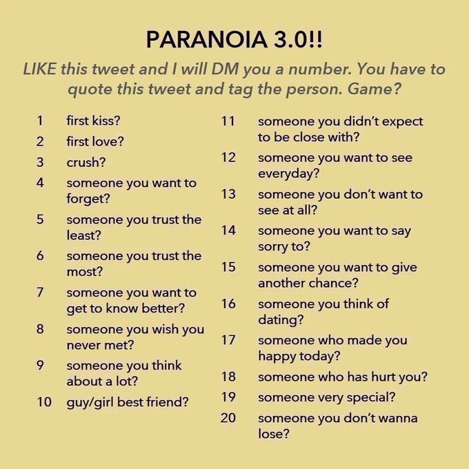 Paranoia 20 Like This Tweet And I Will Dmyou A Number You Have To Quote This Tweet And Tag The Person 11 Last Kiss 12 Last Person You Hugged 13 First Love - How to play paranoia questions game?
