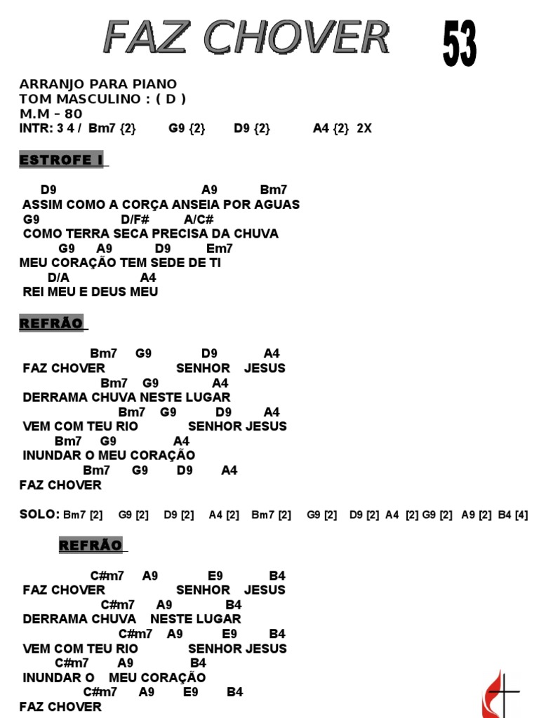 Faz Chover Fernandinho Cifra Melodica Joanir Producoes - Bm g d a bm g d a g d a bm assim como a corca anseia por agua g d em a como terra seca precisa da chuva g a d g meu coracao tem sede de ti d a rei meu e deus meu refrao: