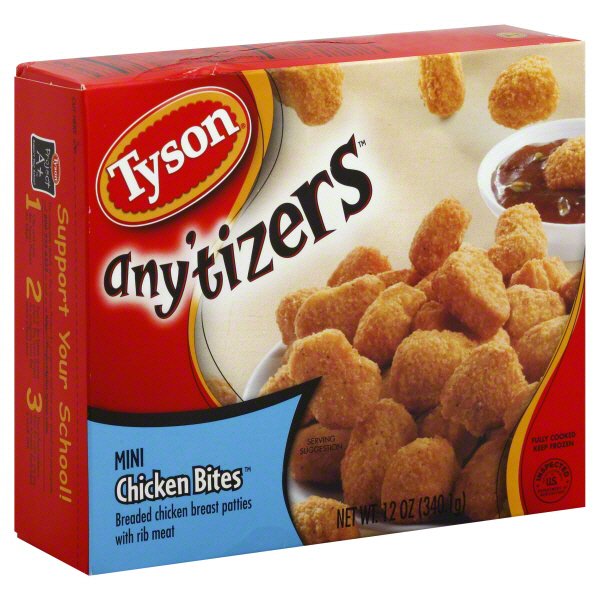 Tyson Chicken Bites / Take snack time to the next level with tyson® any'tizers® buffalo boneless chicken bites. Tyson Chicken Bites / Boneless, skinless chicken breast chunks with rib meat, water, wheat flour, vinegar, aged cayenne peppers, salt.